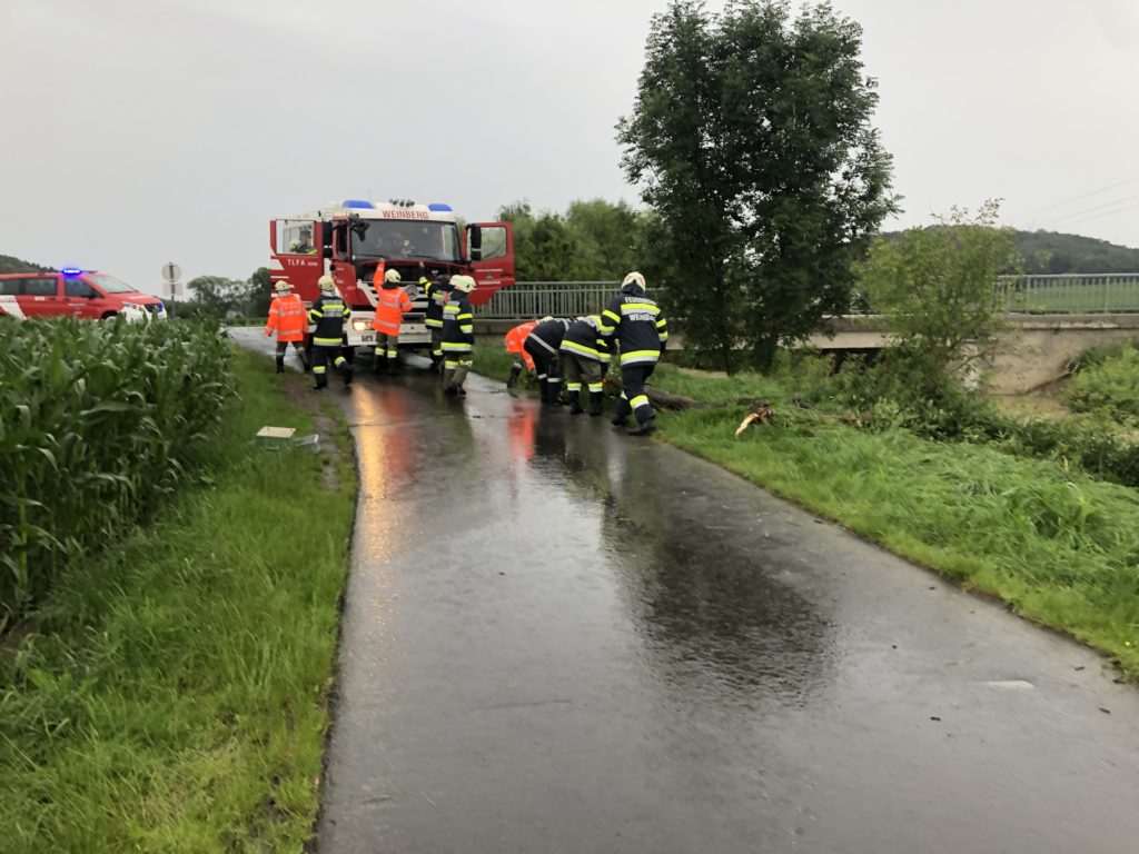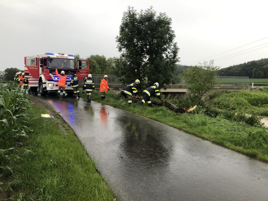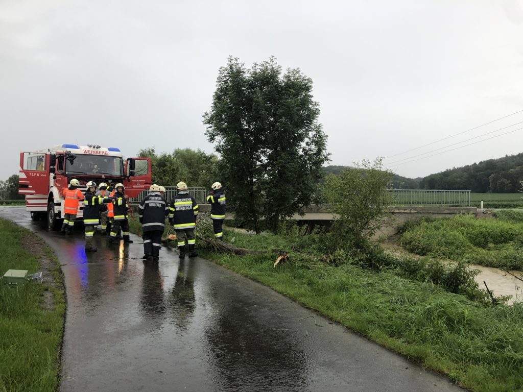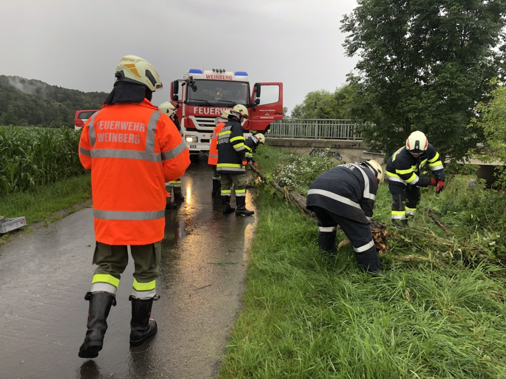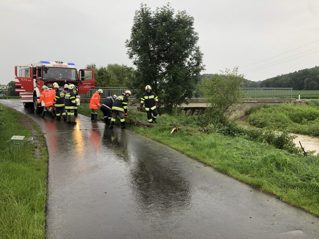 Die durch das Unwetter beschädigten Bäume stellten eine Gefahr der Verklausung dar. Diese Gefahr konnte von der Freiwilligen Feuerwehr Weinberg erfolgreich entfernt werden.