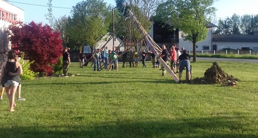 Bereits am Freitag zuvor, wurde der sorgfältig ausgewählte Baum, von einem Team freiwilliger Helfer umgeschnitten und für den Festakt hergerichtet. Aufgestellt wurde der Baum traditionell wie jedes Jahr von den zahlreichern Kameraden und freiwilligen des Ortes Weinberg an der Raab.